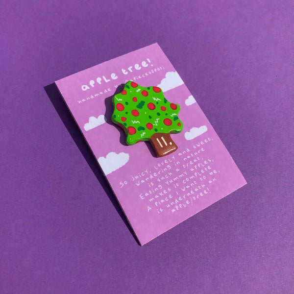 Dwaal door de natuur met dit speldje van een appelboom! Het speldje is handgemaakt met zelfdrogende klei. De verpakking bevat een klein gedichtje waardoor het extra leuk is om kado te geven aan iemand.