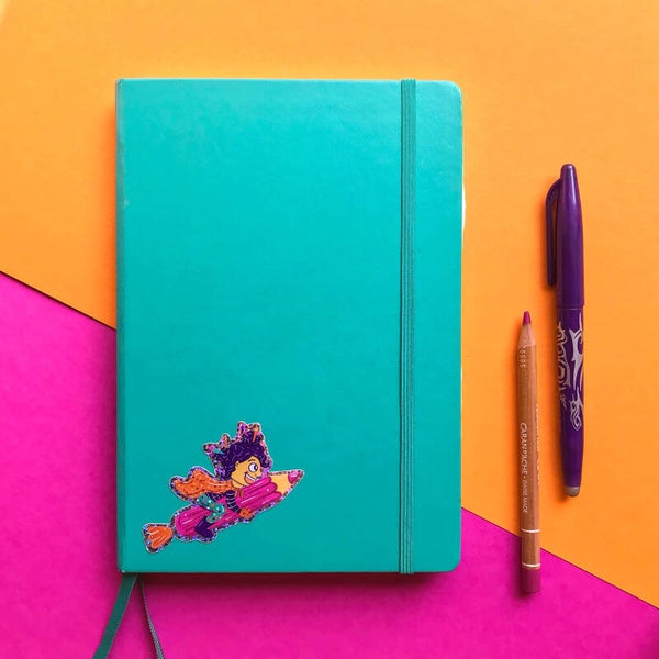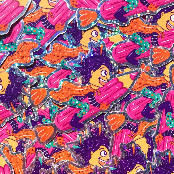 Dit is een glittersticker met een creatieve superheldin op een potloodraket!